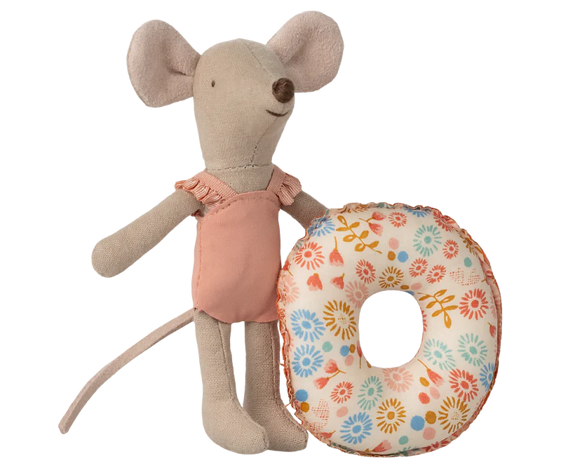 This summer set exist of a little sister mouse dressed in a rose colored swimsuit with her flower printed float around the stomach. She is now ready for a safe swim in sea.