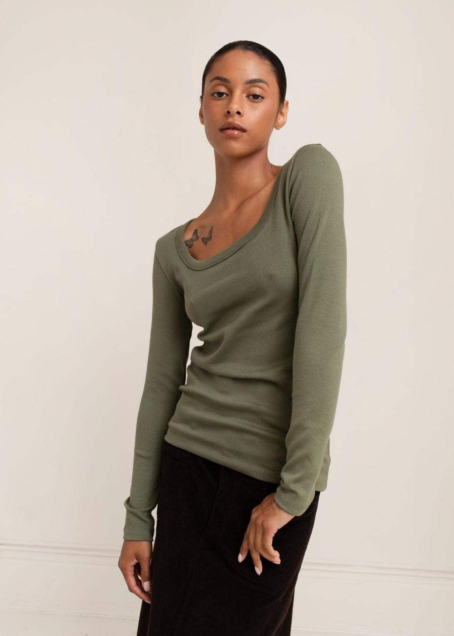 It's made from 1x1 94% cotton 6% spandex rib — body-hugging, stretchy ribbed fabric with a cottony soft feel. An easy piece to wear and update your wardrobe.